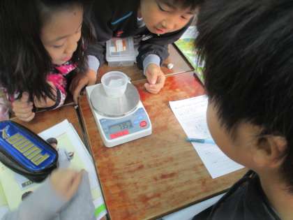 材質のちがう物で,同じ体積の重さを比べる実験です。
