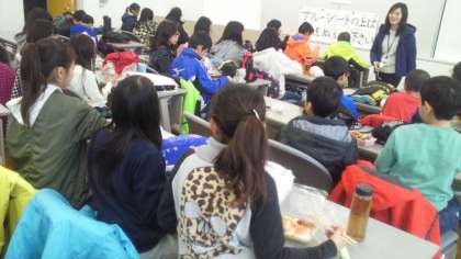 恐竜博物館に無事つきました。研修室をお借りして昼食です。