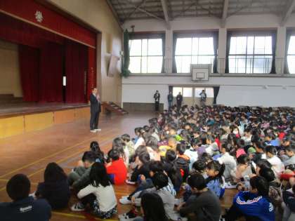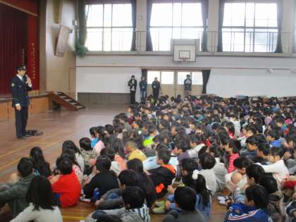訓練後は体育館に集まり,向日町警察署生活安全科の方や地域パトロール隊の方にお越しいただき,お話をしていただきました。