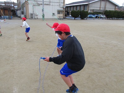 前跳びや後ろ跳び,交差跳び,二重跳びなど,自分にあった練習を行っています。