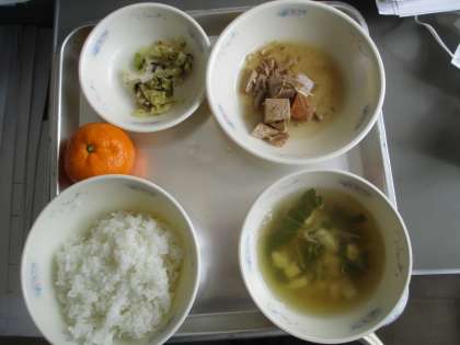 すぐきのいためもの,なまぶしのしょうがに,はななのすましじる,ごはん,みかんでした。