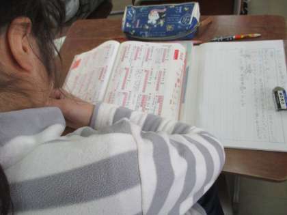 辞書や教科書を使って,漢字の音と訓を使ったかるたを作っています。
