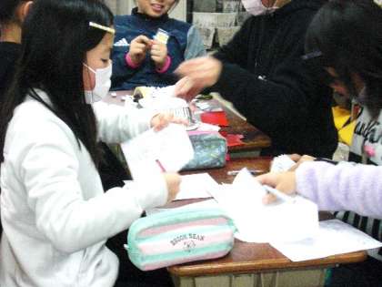 休み時間になるとおわかれパーティに向けてグループごとの出し物を準備しています。