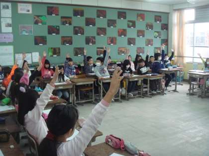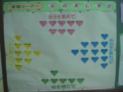教室の道徳コーナー「心のあしあと」には35個のハートがそろいました。