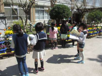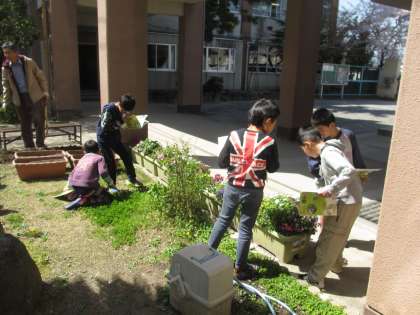 中庭に出て,教科書の図鑑片手に,いろいろな生き物を探しました。