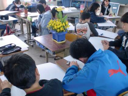 図画工作科の学習で窓辺にある花を描いていきます。