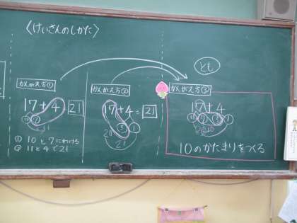 算数では,たしざんとひきざんの学習をしています。今日のめあては,「17+4の計算の仕方を考えよう」でした。子ども達からは,3つの考え方がでてきました。Aの考え方,Bの考え方,Cの考え方をそれぞれ発表しました。Cの考え方がでたとき,子ども達からは「あ〜!!」「AとBの考えがミックスしてる!」「10とか20のまとまりができるから,計算しやすい!」というつぶやきがでてきました。Cの考え方を使って,練習問題にもチャレンジしました。