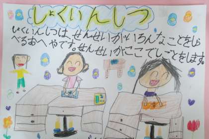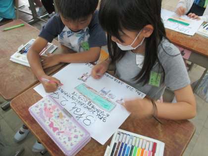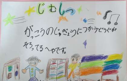 来週,1年生の子どもたちと一緒に学校探検をします。入学した1年生にどんな部屋が学校のどの場所にあるのかを案内します。学校探検にむけて,各部屋にはる看板を,2人1組で部屋の説明やデザインを考えて作りました。