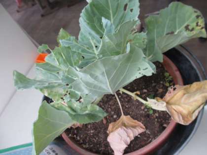 教室のすみに,キャベツの鉢を置いています。