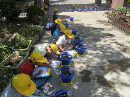 子どもたちは,「なんかしわしわしてる〜!」「ハートみたいなはっぱやなあ。」などと言いながら,熱心にアサガオの様子を観察していました。