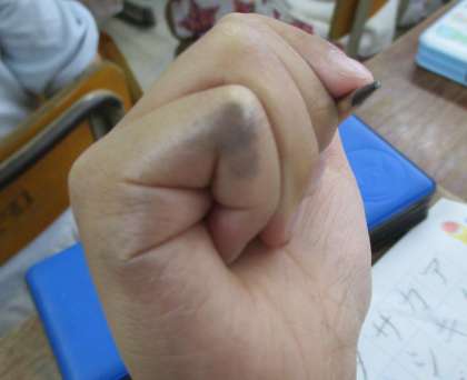 「見て!力いっぱい書いたから,手が黒くなってる!!」