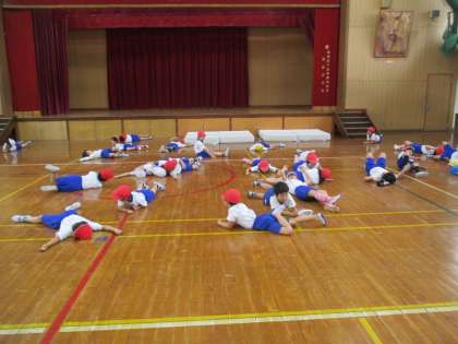 いろいろな運動をして,体をほぐしました。競争ではなく,自分のペースで8分間を