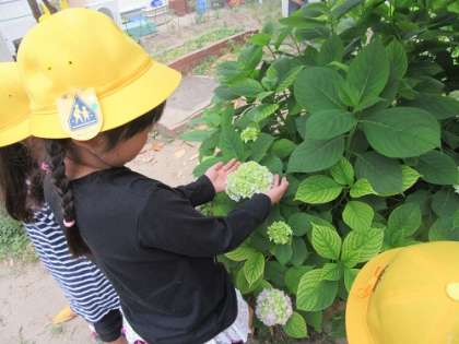 アジサイの花をさわりながら,