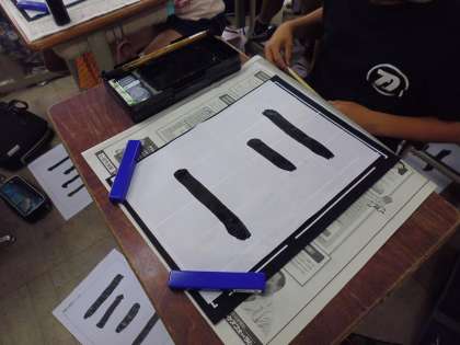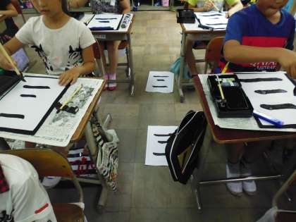 2回目の習字の学習がありました。前回に比べ,準備や練習もスムーズにでき,緊張して横画に挑戦していました。細筆で,名前を書くのが難しいようです。家に帰ってからの筆の手入れは,おうちの人に教えてもらってやってきている児童がいました。