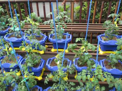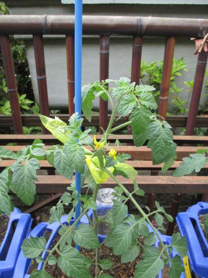 トマトが大きくなってきたので,支柱を1本たてました。ぐんぐん育って,おいしいトマトができますように…。