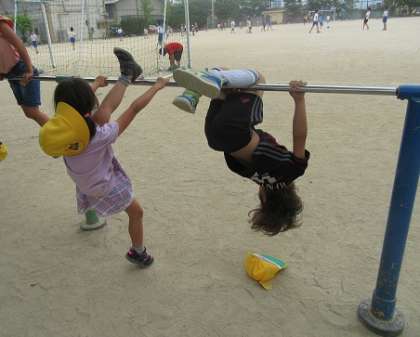 休み時間にもてつぼうで遊ぶ人がたくさんいます。