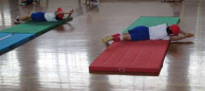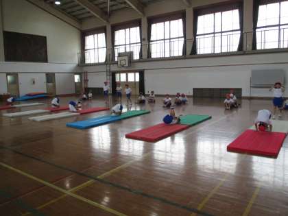 今日の体育の学習は,マット運動です。どのグループもマットの準備の仕方がとても素晴らしかったです。マットの角を,4人でもち,足並みをそろえて運んでいました。その後,ピシッとそろえて定位置に置いていました。協力する姿と学習への意欲を感じられました。