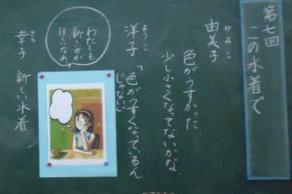 資料「この水着で」を使って,水泳能力検定を終えた主人公(ゆみこ)の水着への思いを考えることを通して,物の価値を正しく知り,大切に活用しようとする心情を育てることを狙いに学習をしました。