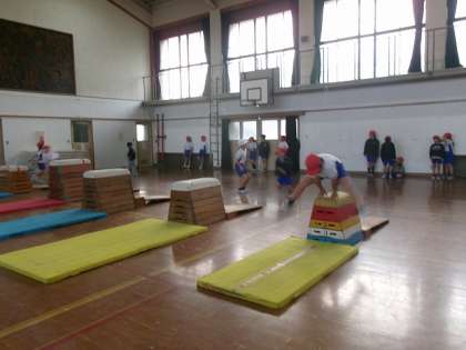 体育では、とび箱運動をしています。ねらい1では、高さにチャレンジし、ねらい2では、少し頑張ればできそうな技にチャレンジしています。上手にできるように何度もチャレンジしています。準備や片付けもスムーズにできるようになりました。