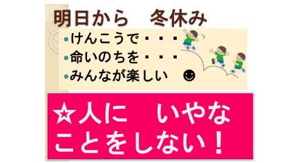 「この学期は、羽束師スポーツフェスティバルなど、たくさんの行事を通して大きく成長しました。学習面でも、一人ひとりが目標に向かって努力する姿が見られ、頼もしく感じていました。冬休みは、これまでの学びを振り返り、3学期に向けて準備する大切な時間です。ぜひ、ご家庭でも読書や計算練習など、学習を続ける工夫をしてください。生活面では、早寝・早起き・朝ごはんをしっかり行っていきましょう。また、安全に過ごすことも忘れないでください。交通ルールを守り、外出時は必ず行き先を伝えること、インターネットの使い方にも注意しましょう。