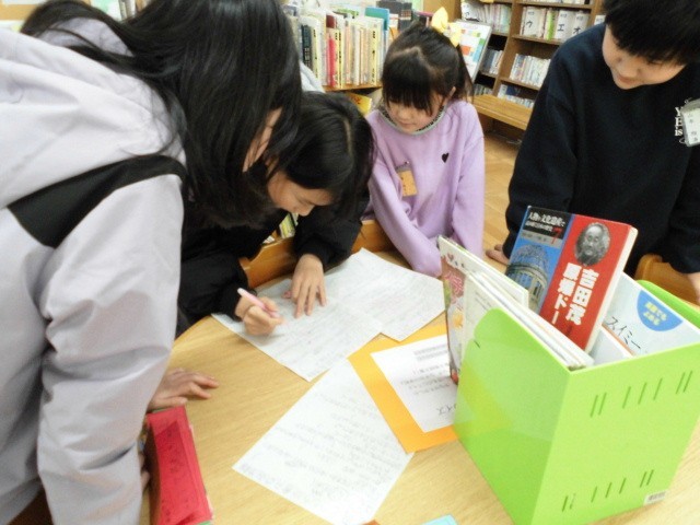 クイズに答えた用紙を図書館に持っていくと、図書委員会の児童が丸付けを行い、