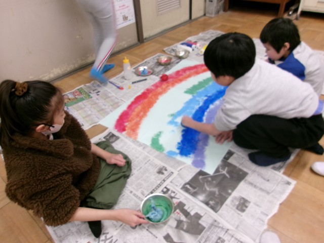 2・3年生は虹とおめでとうの文字を作る担当です。