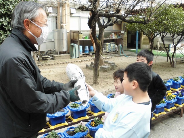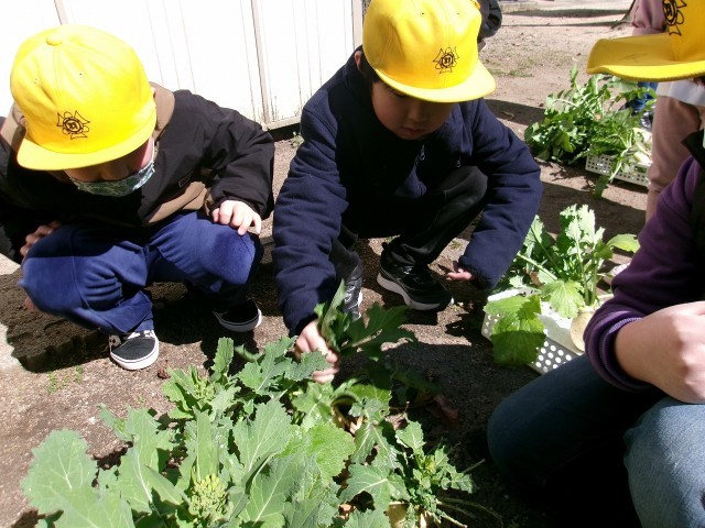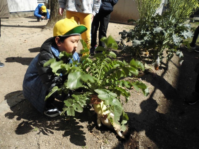 畑で育てた大根とカブを収穫しました。種から育てた野菜が大きくなっていて、みんな大興奮でした。収穫した野菜は、みんなで調理をしたり、お世話になった教職員の方にプレゼントしたりしました。