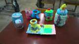 図工「空きようきのへんしん」の学習で粘土をしました。家から持って来た空き容器を利...