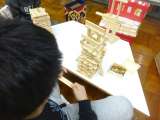 空き時間に積み木で遊びました。6年生児童が「一番高く積み上げた人が勝ちです。」と...