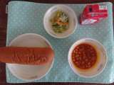 今日の献立は,味つけコッペパン・牛乳・ポークビーンズ・アスパラガスのソテーです...