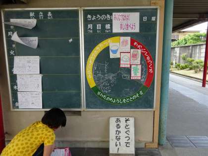 昼休みの様子です。 給食委員会の子どもが,献立黒板の作成をしていました。