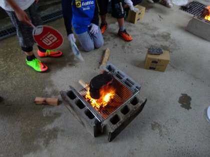 野外炊事をしました。 今日は,あいにくの雨でしたが,てきぱきと動いて,飯盒を火にかけていました。