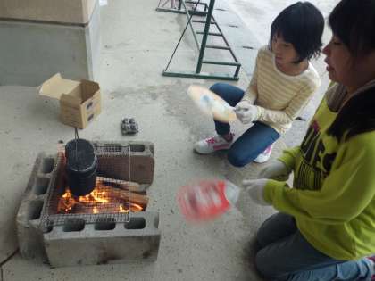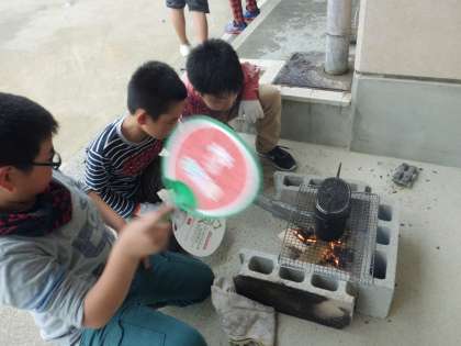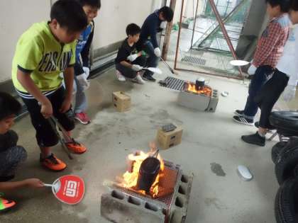 かまどに火をおこすことにだいぶ苦労していましたが,みんなでがっちり協力していました。