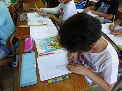 算数の学習の様子です。 今日は,垂直・平行の作図のしかたを利用して,長方形を作図しました。