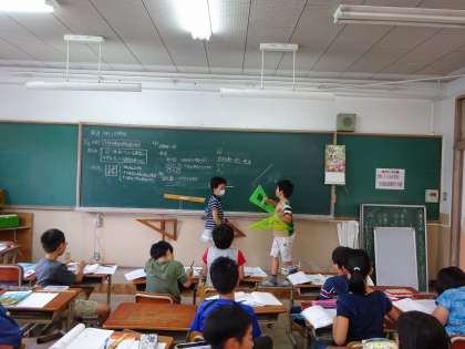 垂直・平行と四角形の学習の様子です。 上手に三角じょうぎを2枚使い,垂直や平行の作図をしました。