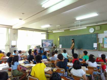 図画工作の学習の様子です。 クリップを見て,電動のこぎりの使い方を確認しています。