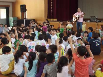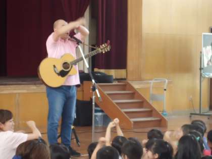 まっちゃんこと,町田浩志さんが明親小の体育館に来てくださって,本校の1年生と地域の保育園保育所に通うお友だちがいっしょにコンサートを楽しみました。