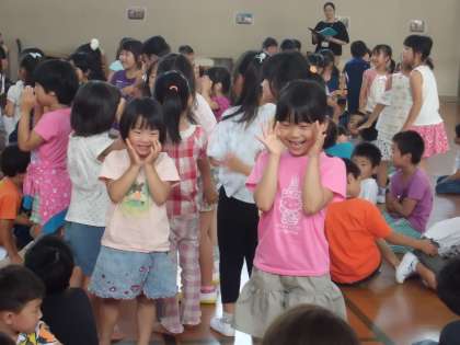 まっちゃんのギターに合わせてみんなノリノリで笑顔がはじけました。これは「つながりあそび・うた」というジャンルになるそうで,音楽に合わせて歌ったり遊んだりしているうちに,自然に隣の人となかよしになっているという,大変楽しいものでした。