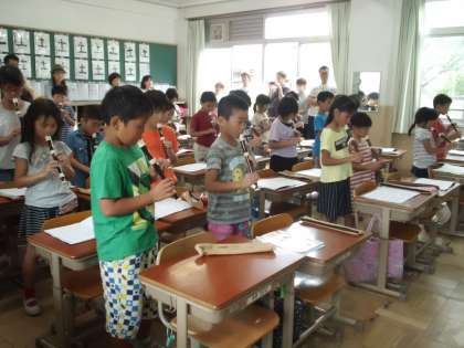 1組は音楽。3年生から開始したリコーダーで「笛星人」の楽曲を演奏していました。なかなか良い音が聞こえていましたね。これからどんどん使える音が増えていくのが楽しみです。