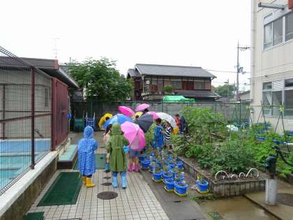 雨の日の様子を探検しています。 五感を使っていろいろな物をみています。