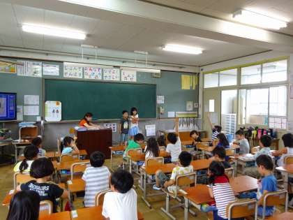 学校探検をして,先生にインタビューをしたことを発表しています。