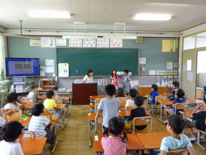 学校探検で調べた内容を発表しています。 校内の教職員の方々にも上手にインタビューできました。