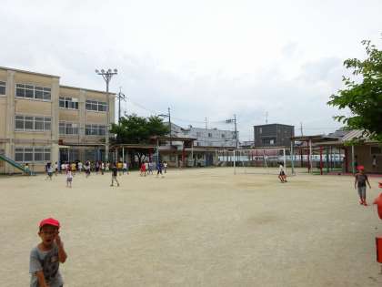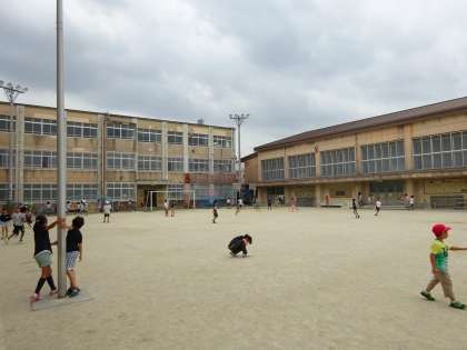 中間休みの様子です。 グラウンドでは,子ども達が,鬼ごっこや総合遊具などで遊んでいます。