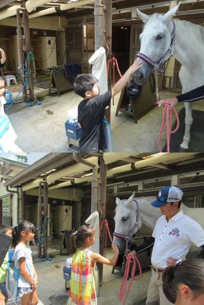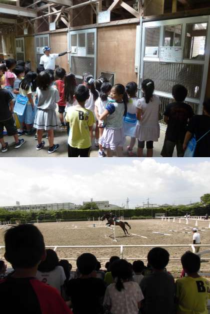 はじめにミニチュアホースで,馬の体について教えてもらい,そのあと馬房でえさについて説明してもらいました。そして外の馬場で馬のジャンプを目の前で見せてくれました!迫力満点のジャンプに子どもたちは大興奮でした。最後にきれいな牝馬を触らせていただき,大満足の1時間でした!
