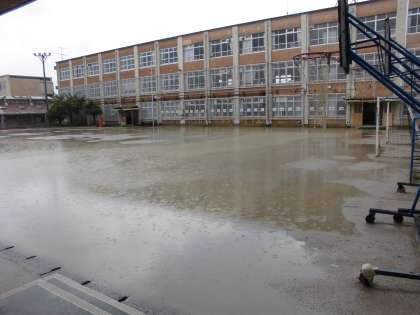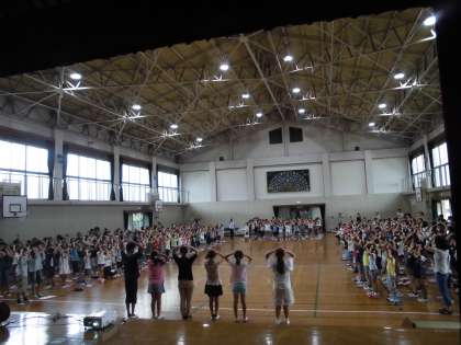 児童集会がありました。まずは英語の歌の全校合唱です。少し前に雨が降り運動場がこんな状態になりました。みんなの元気な歌声のおかげで雨もやでくれました。