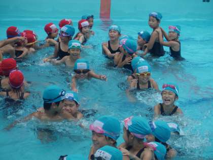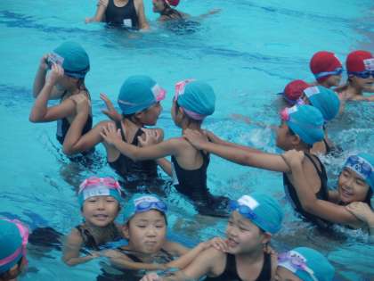 夏休み スタート! 公開日 2017/07/24 更新日 2017/07/24 学校の様子 夏休みが始まりました。午前中は低学年の水泳教室です。プールに1・2年生の元気な歓声がひびきわたっていました。 写真は,「かもつ列車」で友だちとどんどんつながっている様子です。学校のプールで1・2年生が一緒に学習することは今日が初めてです。子どもたちの笑顔がはじけています。