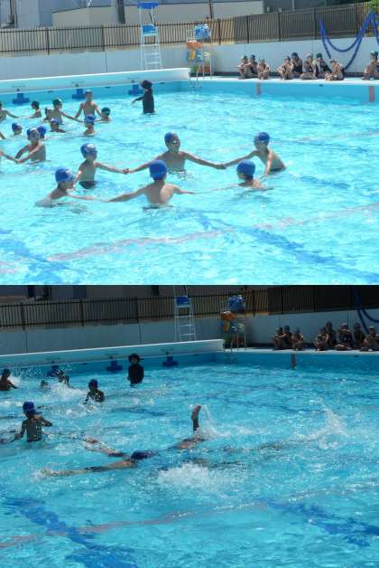 0726 3年生 水泳教室 公開日 2017/07/26 更新日 2017/07/26 学校の様子 午後は,4年生と一緒に水泳教室。 こちらもたくさんの参加でした。 2〜6人組で手をつないで,輪になってバタ足して浮かぶ練習をしたり,泳力別に練習したりして,とっても気持ちよさそうでした。