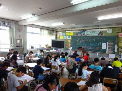 2組の教室でみんなが集まって勉強しています。