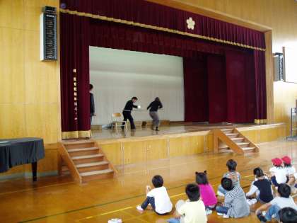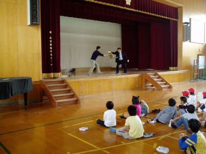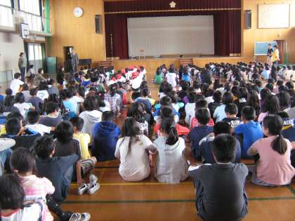 今日は中間休みの終わりから避難訓練をしました。中間休みに不審者が北門付近に現れたという設定で訓練を実施しました。伏見警察署からも避難の仕方などを教えに来ていただきました。訓練の後,体育館で防犯の話を聞いたり,護身の方法を教えていただいたりしました。