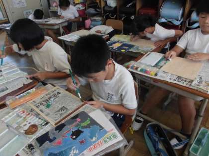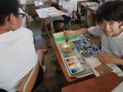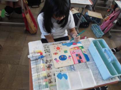 図工の学習の様子です。今日は木の板に絵の具を塗ったり,ニス塗りをしたりしました。それぞれの世界観を上手く表現しています。